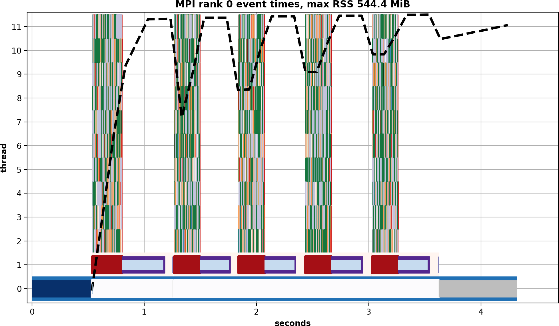 When run the teca_profile_explorer creast an interactive window displaying a Gantt chart for each MPI rank. The chart is organized with a row for each thread. Threads with more events are displayed higher up. For each thread, and every logged event, a colored rectangle is rendered. There can be 10’s - 100’s of unique events per thread thus it is impractical to display a legend. However, clicking on an event rectangle in the plot will result in all the data associated with the event being printed in the terminal. If a memory profile is passed on the command line the memory profile is normalized to the height of the plot and shown on top of the event profile. The maximum memory use is added to the title of the plot. Example output is shown in Fig. 15.